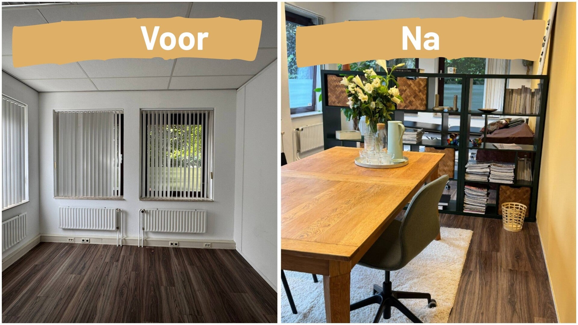 We begonnen met een moodboard als gezamenlijk vertrekpunt. Dat gaf richting aan onze keuzes én liet ruimte voor persoonlijke inbreng. We kozen bewust voor duurzaam en vintage: een ‘gratis af te halen’ massief eikenhouten tafel werd het hart van de ruimte, aangevuld met vondsten uit de kringloop die sfeer en karakter toevoegen zonder het budget te belasten.